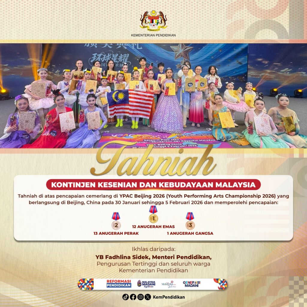 Tahniah dan Syabas diucapkan kepada Kontinjen Kesenian dan Kebudayaan Malaysia atas kejayaan cemerlang dalam International Youth Performing Arts Championship (YPAC) 2026 yang berlangsung pada 30 Januari hingga 5 Februari 2026 di Beijing, China.